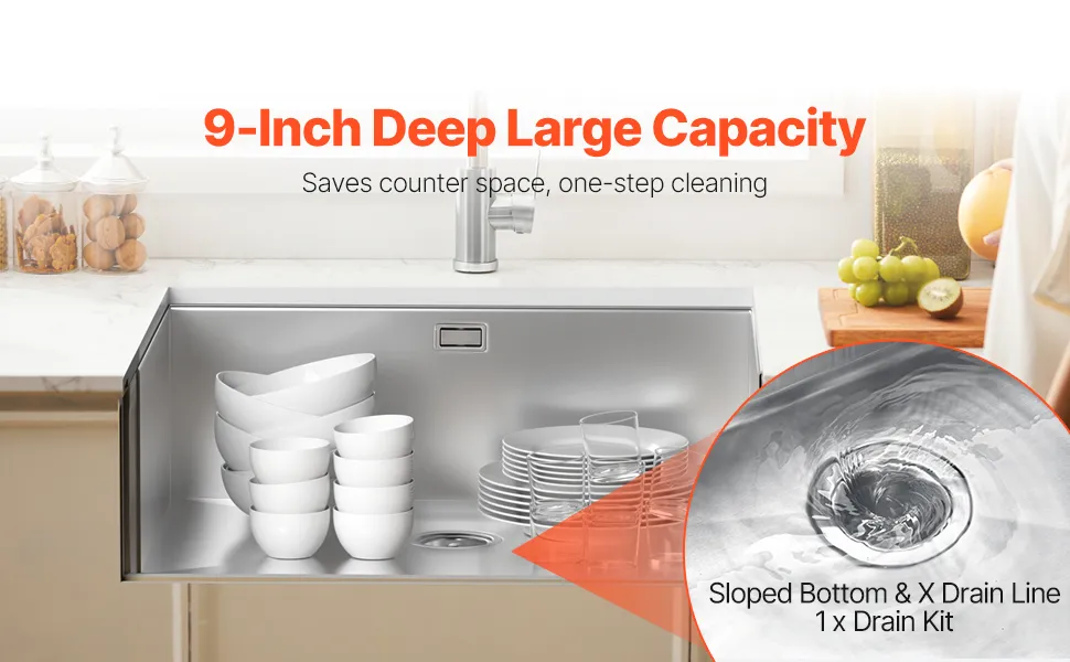 This prep kitchen sink features a sloped bottom and X-shaped drain design, equipped with a drain kit to ensure quick drainage and prevent water accumulation. The standard drain opening fits any garbage disposal unit.