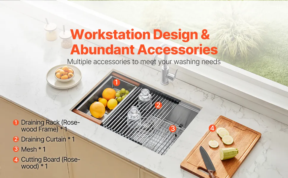 • Workstation Kitchen Sink: The single-tier track workstation design allows accessories to slide over the sink, simplifying meal prep and cleanup without wasting kitchen counter space. Our household dishwasher sink have multiple accessories: drying rack (rosewood frame) x1, drying matx1, grid x1, cutting board (rosewood) x1.