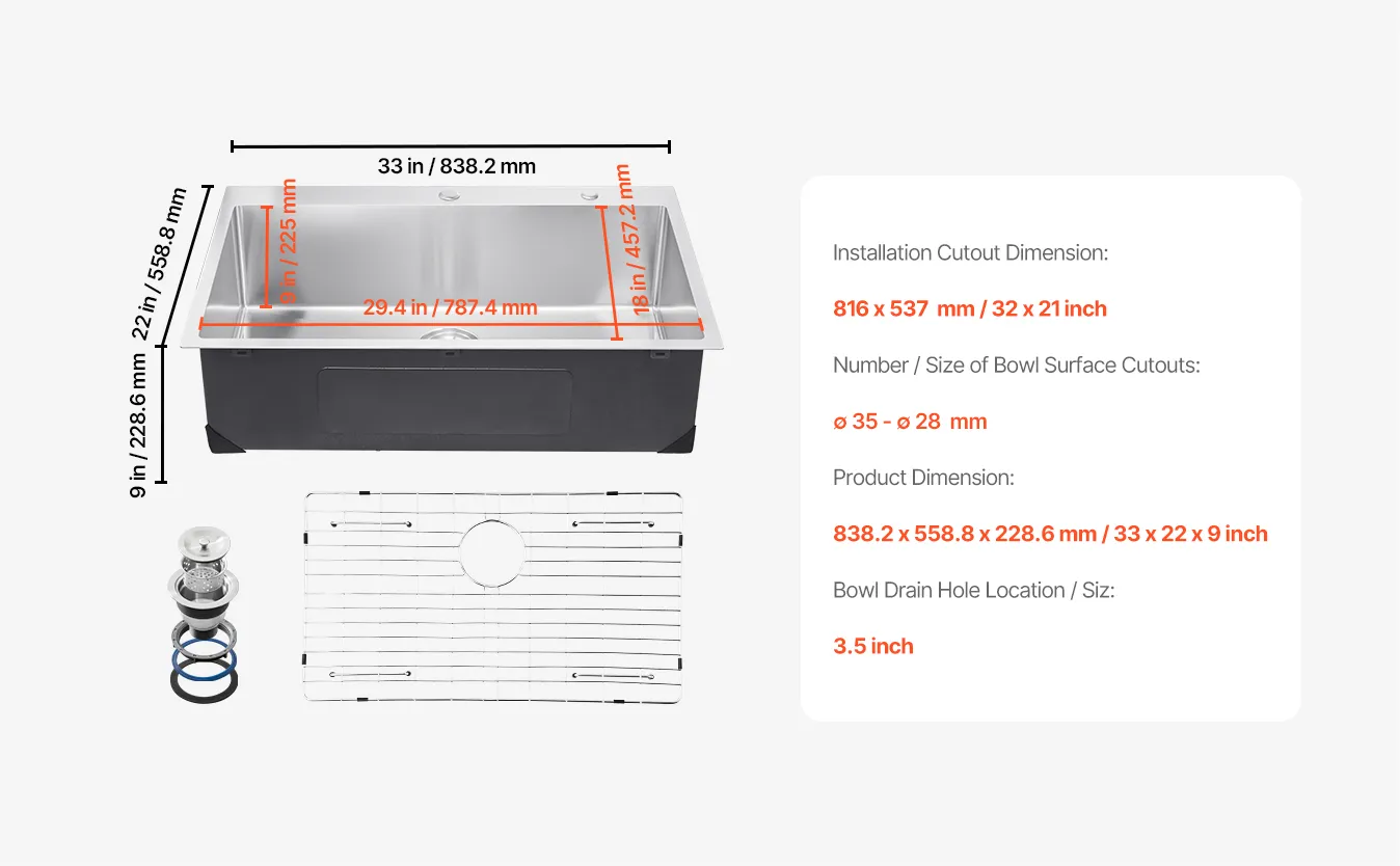 Large Capacity: Sink External Dimension: 33x22 inch. Internal Dimension: 32x21 inch. Bowl depth: 9 inch. This kitchen drop-in basin is deep enough to accommodate cups, pots, and baking trays, meeting various washing needs.