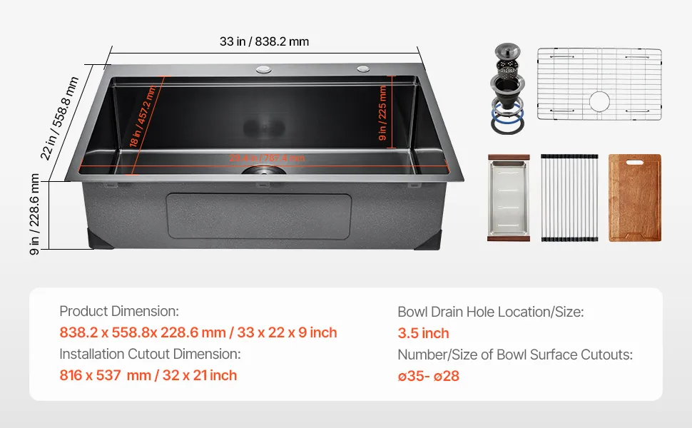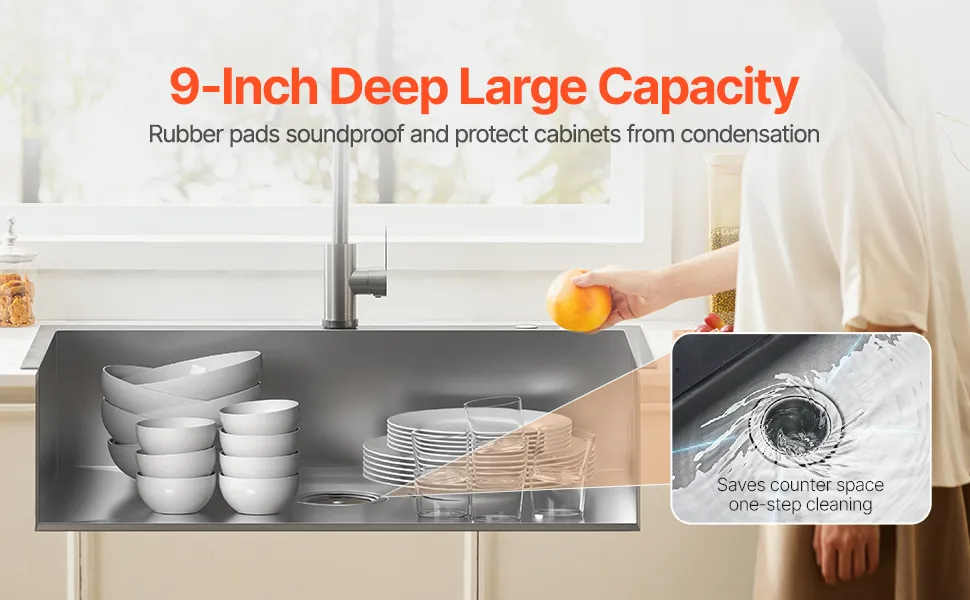 Large Capacity: Sink External Dimension: 33x22 inch. Internal Dimension: 32x21 inch. Bowl depth: 9 inch. This kitchen drop-in basin is deep enough to accommodate cups, pots, and baking trays, meeting various washing needs.