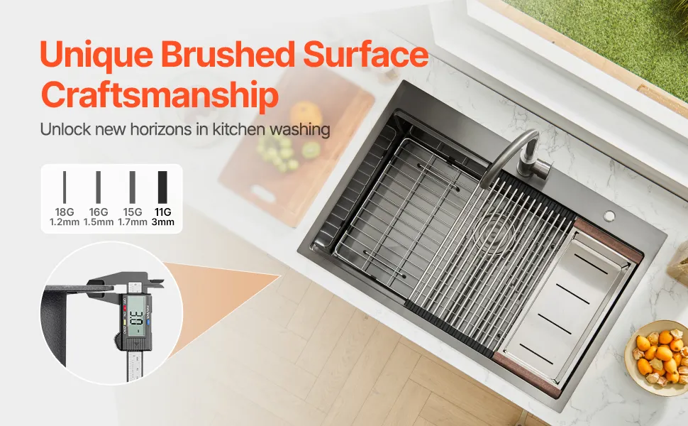 Premium Nano Black Finish: Featuring an innovative nano PVD brushed surface, this kitchen sink workstation is corrosion-resistant, dent-resistant, and easy to clean. Again, avoid sharp objects to prevent surface scratches. The upgraded panel thickness is 3 mm, 50% thicker than most standard kitchen sinks. It features R10° rounded corners for easy cleaning and a modern aesthetic.