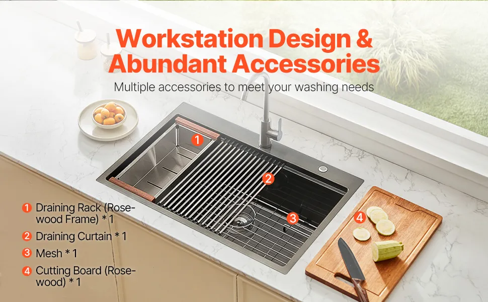 Workstation Kitchen Sink: The single-tier track workstation design allows accessories to slide over the sink, simplifying meal prep and cleanup without wasting kitchen counter space. Our household dishwasher sink have multiple accessories: drying rack (rosewood frame) x1, drying matx1, grid x1, cutting board (rosewood) x1.