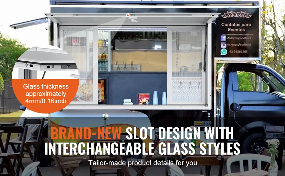 The concession window features four horizontal sliding windows. These windows work smoothly, allowing for easy service and efficiency. The user-friendly design of the sliding mechanism ensures effortless window sliding. Hence, it's easier to serve customers quickly. Also, lockable features add an extra layer of security. The smooth operation of the sliding windows enhances the overall efficiency of the food truck. So you can serve food more conveniently and quickly. It is a great feature for busy food service operations.