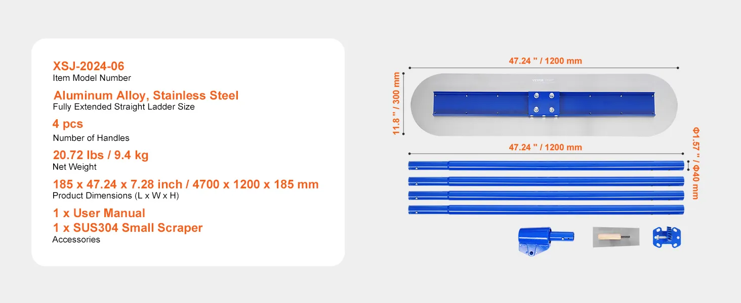 Exceptional Efficiency: With a 1.5mm thick scraper and a smoothing area of 47 x 11.8 in (1200 x 300 mm), our concrete float significantly boosts efficiency, saving time, labor, and reducing fatigue.