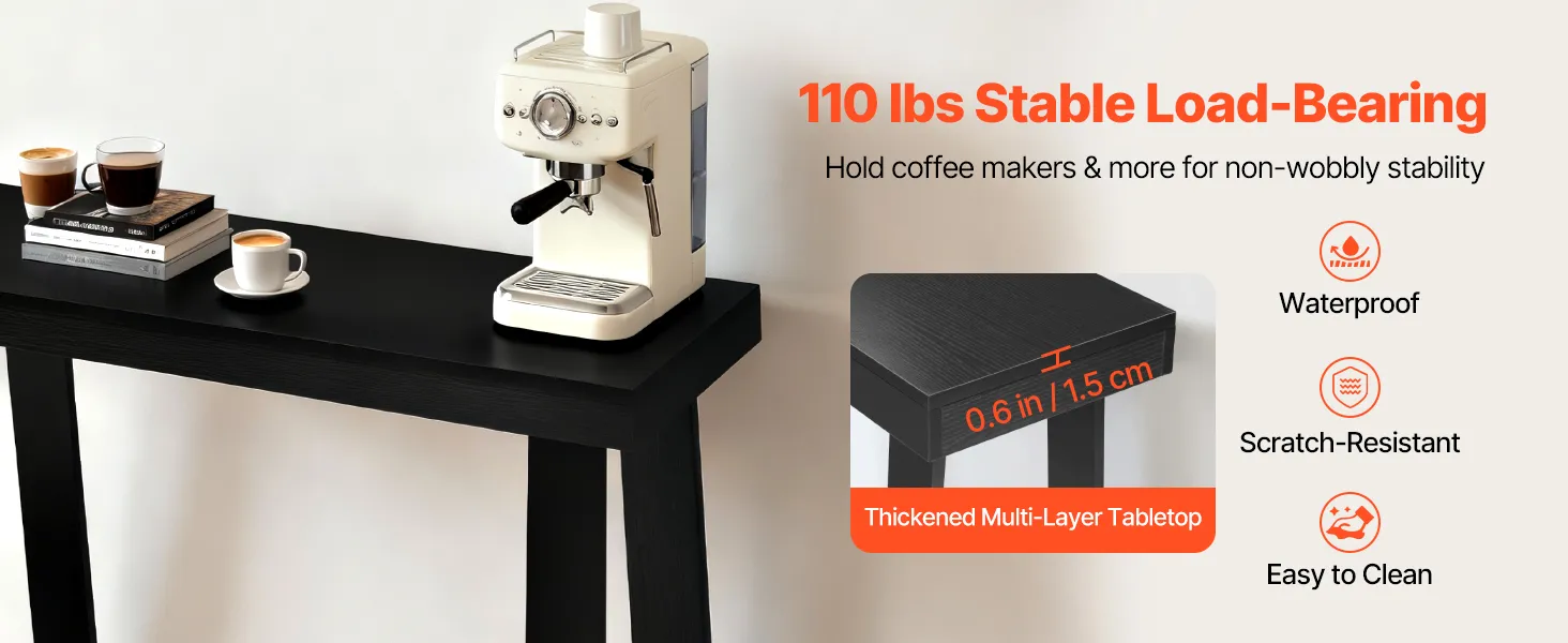 Our behind sofa table narrow features a thickened particleboard tabletop. It provides solid support for small appliance and utensils like coffee makers, or your favorite decorative paintings and photo frames.