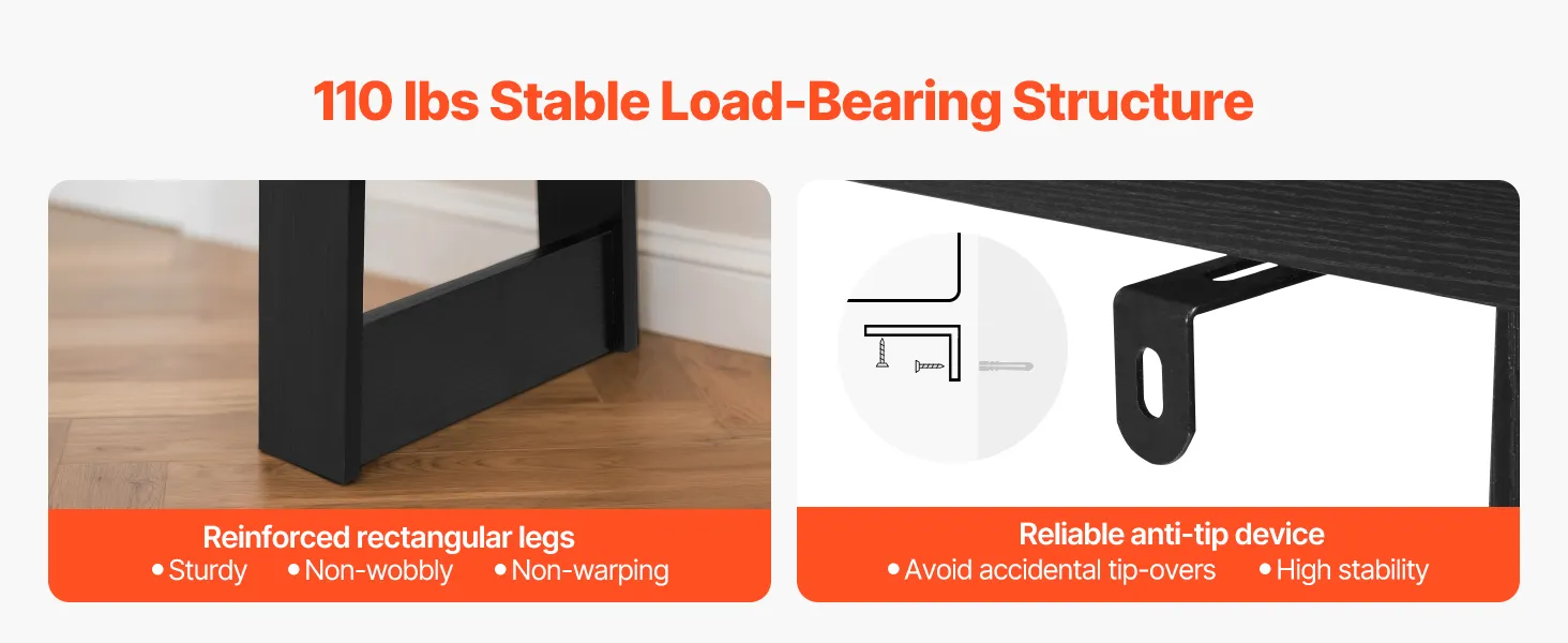 Built with a stable rectangular structure, the sofa table with outlet remains sturdy and non-wobbling even when holding small appliances. It also includes a tip-resistant device to enhance stability. Please be sure to install the tip-resistant device before use.