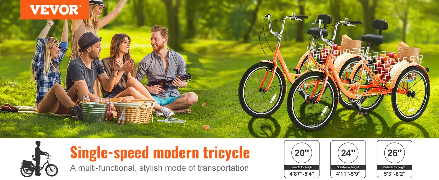 Multiple Size Options: Multiple sizes and colors available. Height 4'8" - 5'6" suitable for 20" wheels; height 4'11" - 5'10" suitable for 24" wheels; height 5'3" - 6'2" suitable for 26" wheels. Please choose according to your actual situation. The adult tricycle comes with a colored manual, and assembly tools, etc. You can make your purchase with confidence.