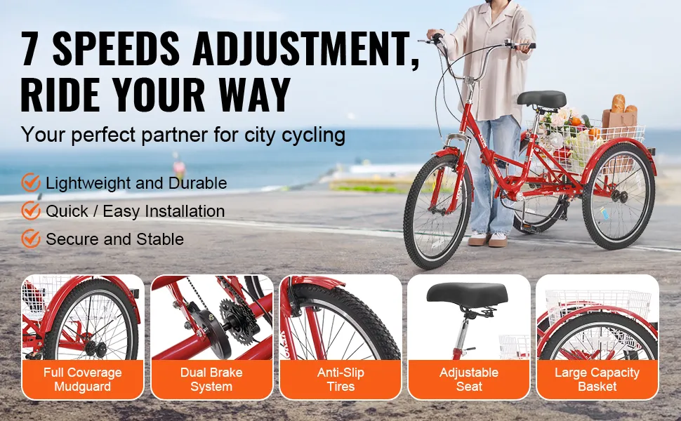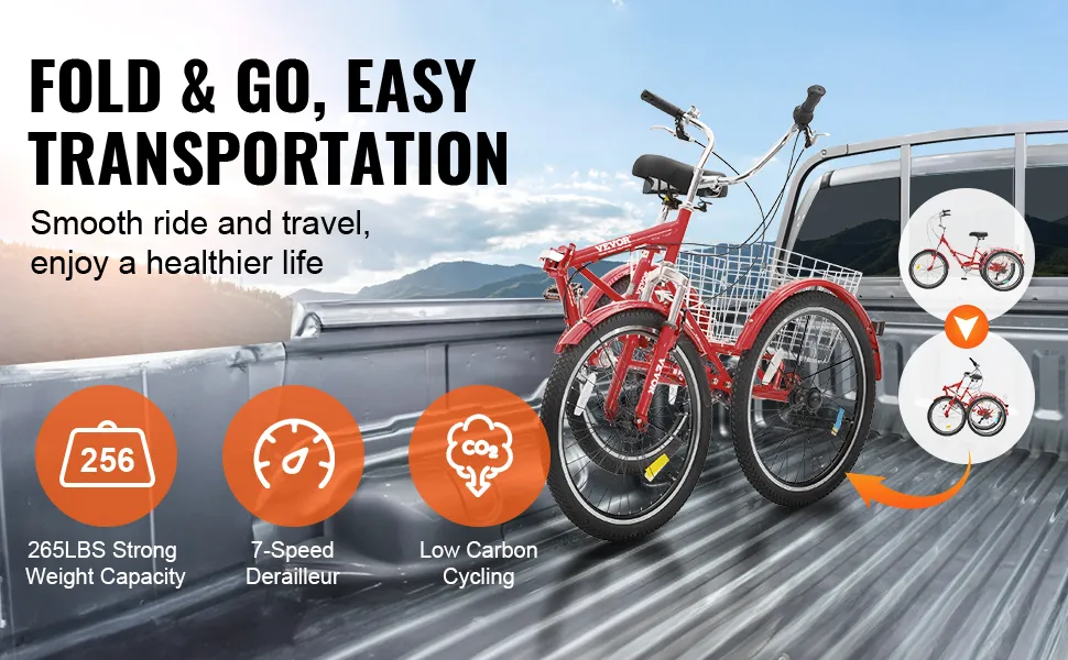 The VEVOR folding adult tricycle has a convenient folding design. This makes it easy to store and transport. You can easily fit it into an SUV for trips. It's also simple to keep in your house. The tricycle folds in half for compact storage. That'll be beneficial for those with limited space. User-Friendly Features Our folding mechanism is user-friendly. Therefore, you can quickly fold and unfold the tricycle. This adds to its overall convenience. The design helps make it practical for various purposes. Whether traveling or storing it at home, it's so straightforward to manage. One feature enhances the versatility of the tricycle.