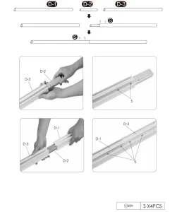 Front Pole Assemble: Insert Front Pole Connector (D-2) into Right Front Pole(D-3) and secure it with a screw (S). Connect the left front rod (D-1) to the connector (D-2) and secure it with the screw (S). You now have a full-length front bar.