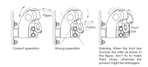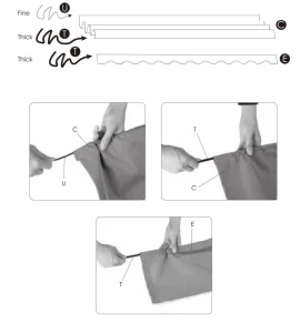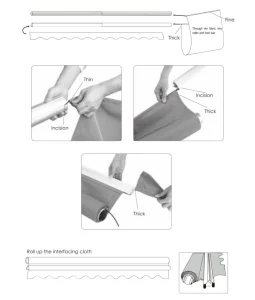 Put the end of the fabric with the thin strip in the groove of the roller. Then put the thick strip in the cut of the front bar and put the end of the flounce with the other cut.