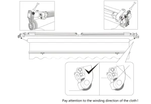 Assembly of the whole awning: Insert the square shaft in the roller with the fabric into the square hole of the gearbox, and link it with a round shaft on the right side using a hammer.