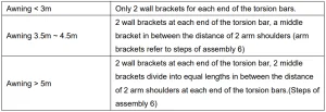 5. Install the awning on the wall brackets according to “Installation distances between wall brackets” above, put the original bolts on them, and tighten them. Finally, fasten all expansion bolts.