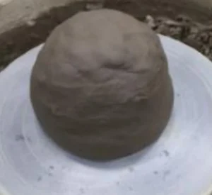 - Take out a proper amount of clay, throw the mud ball in the center of the wheel, and press it (wet your hands).