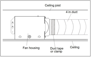 6. Install a circular 4 in. duct (not included) and secure it with duct tape or clamps (neither included). Finish ceiling work. The ceiling should be aligned with the edge of the fan housing.