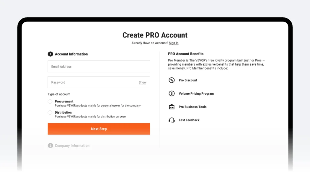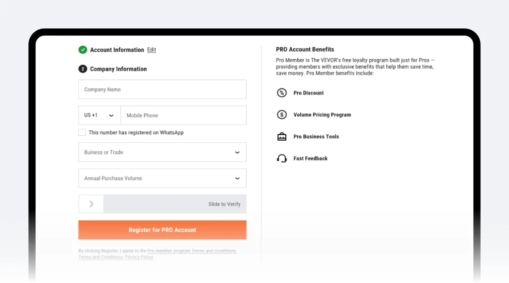 To join and qualify for wholesale tool pricing at VEVOR, you need to create a “Pro Member Account.” Once your account is created, you can buy all the products at wholesale prices.
