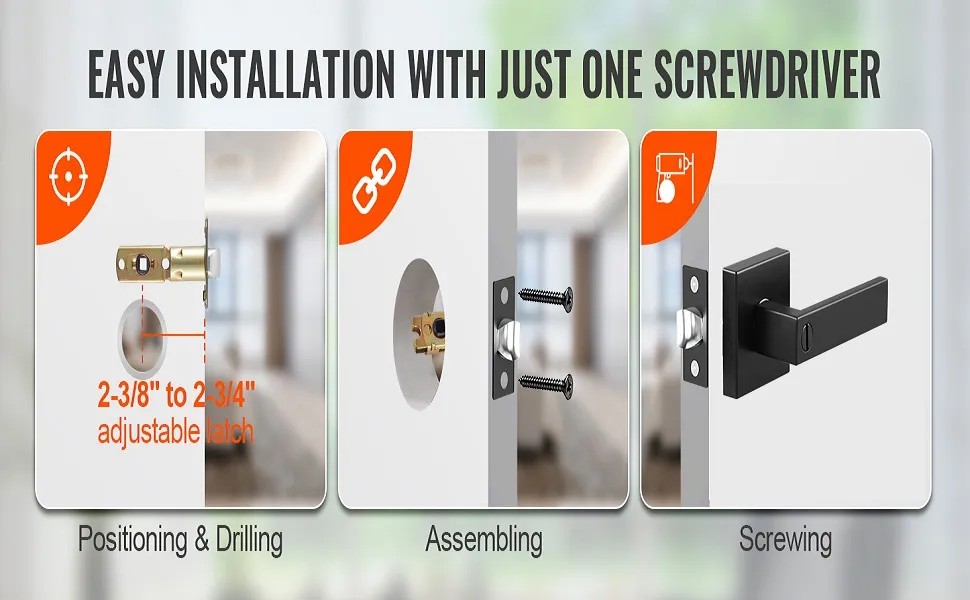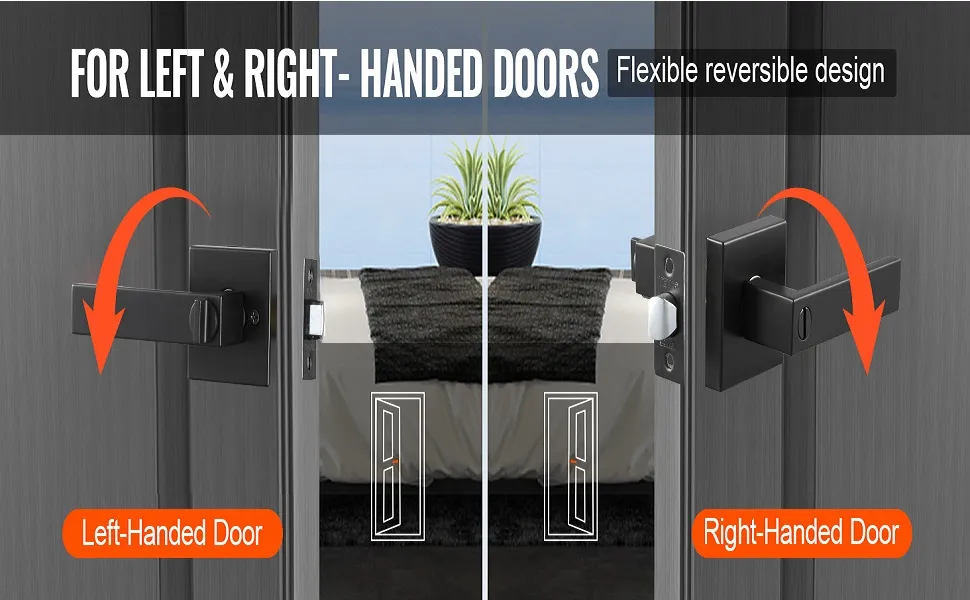 Diseño universal y reversible: Nuestra manija negra para puerta incluye un pestillo ajustable de 60 mm o 70 mm, compatible con puertas de entre 35 mm y 45 mm de grosor. Su diseño reversible permite su instalación tanto en puertas de apertura izquierda como derecha, lo que la hace adecuada para más del 95 % de las puertas interiores.