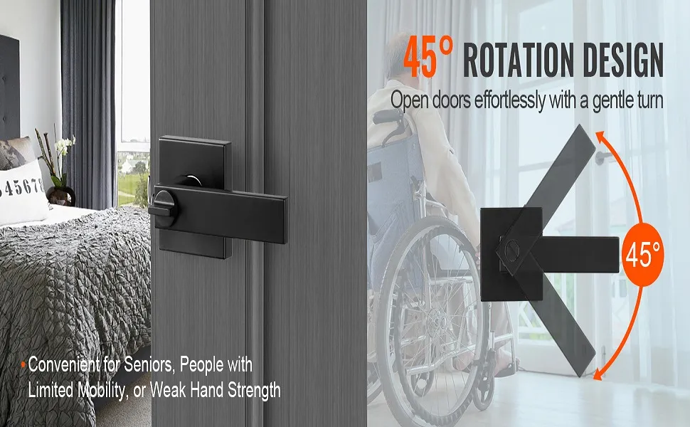 El innovador diseño de la palanca de rotación de 45° requiere menos esfuerzo en comparación con los mangos de rotación tradicionales de 90°, lo que lo hace conveniente para personas mayores, personas con movilidad limitada o aquellas con poca fuerza en las manos.