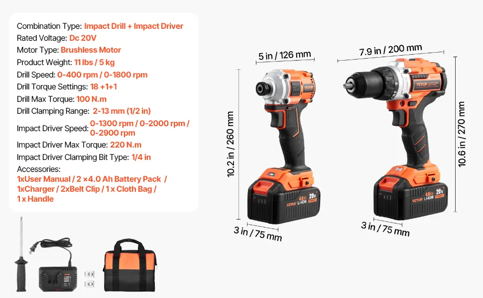 2-Piece Tool Set: This tool combo kit includes a 1/2 in impact drill, a 1/4 in impact driver, and two 20V 4Ah batteries, designed for professional users to meet high-intensity, high-efficiency work demands. Ideal for professional repairs, home renovations/assembly, and construction sites, this is the great choice for both professionals and homeowners to tackle various projects