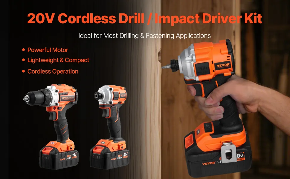 VEVOR Tool Combo Kit, 20V Max Cordless 2-Tool Combo Kit, with 1/2 in Impact Drill, 1/4 in Impact Driver, Compact Cordless Power Tool Combo Kit with 4.0 Ah Batteries, Screws, Charger, and Cloth Bag