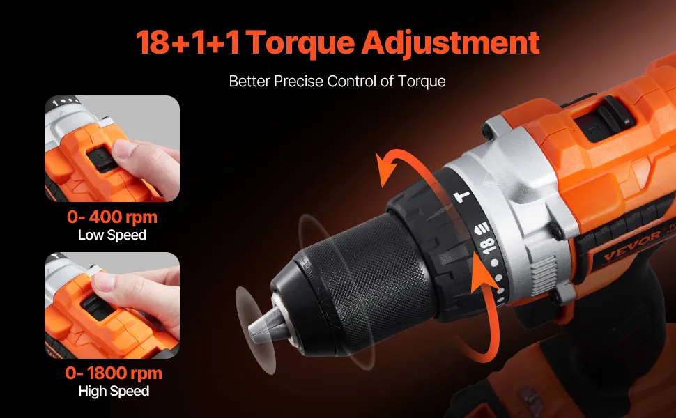 High-Performance Impact Drill: Our brushless tool combo kit has a cordless 1/2 in impact drill. The drill delivers a maximum torque of 100 N.m and equips two speed settings (0-400 RPM or 0-1800 RPM). With 18+1+1 torque settings, it provides precise torque adjustments, helping you effectively penetrate materials