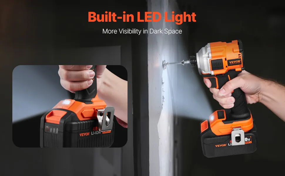 The built-in LED light ensures ample illumination when the cordless drill and impact driver working in dark or low-light environments, allowing you to complete tasks accurately.