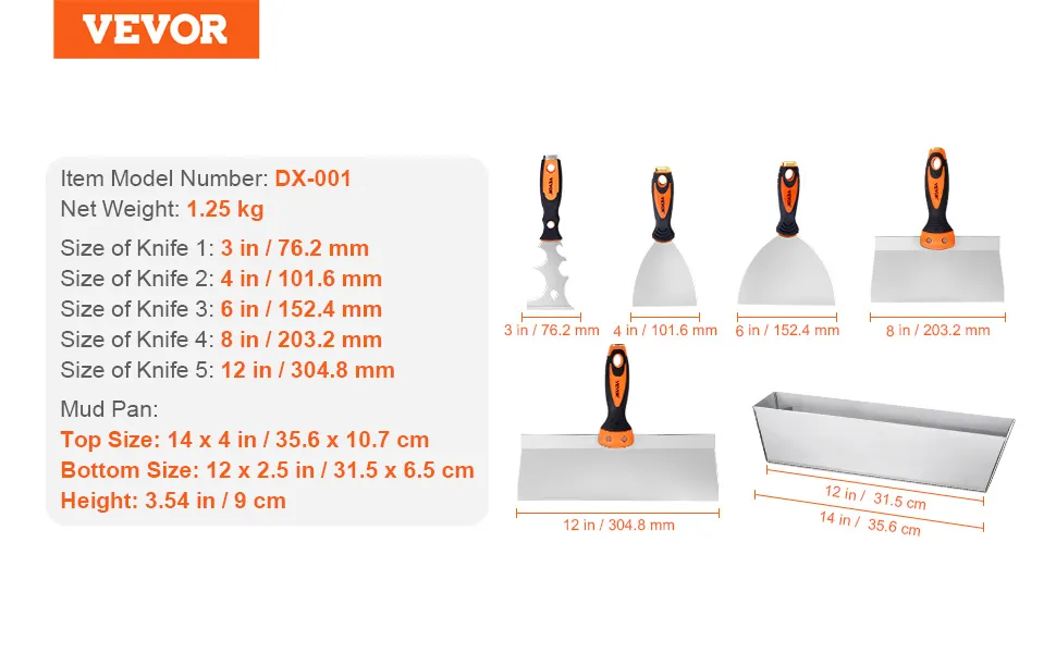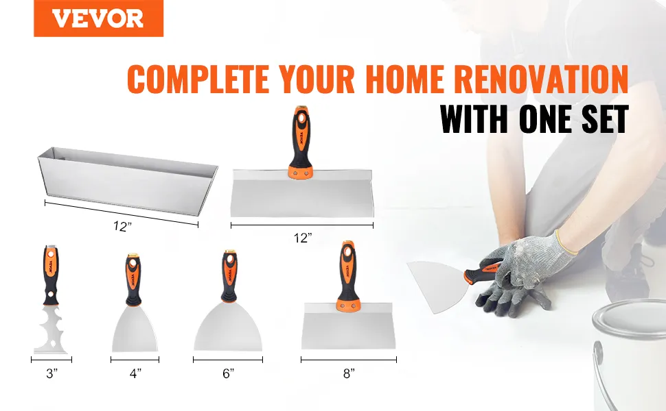 This set includes a 3" painter's scraper, 4" and 6" putty knives, 8" and 12" taping knives, and a 12" mud pan. With this comprehensive toolset, you can easily tackle various home renovation challenges.