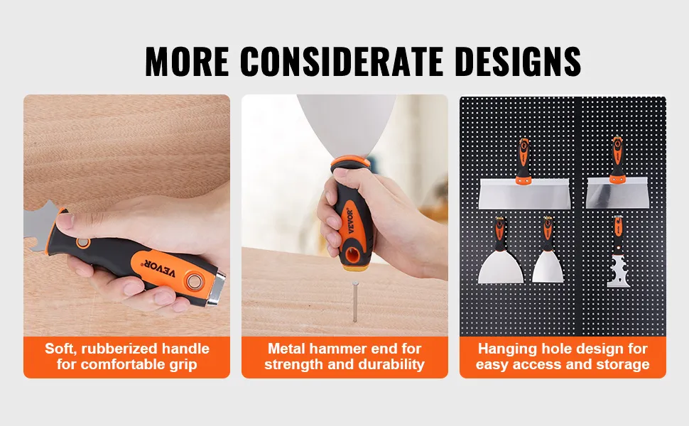 Designed for your comfort and convenience during use. The soft, rubberized handle offers a comfortable grip, while the sturdy metal hammer end is durable. The hanging hole design makes it easy to store and access the tools.