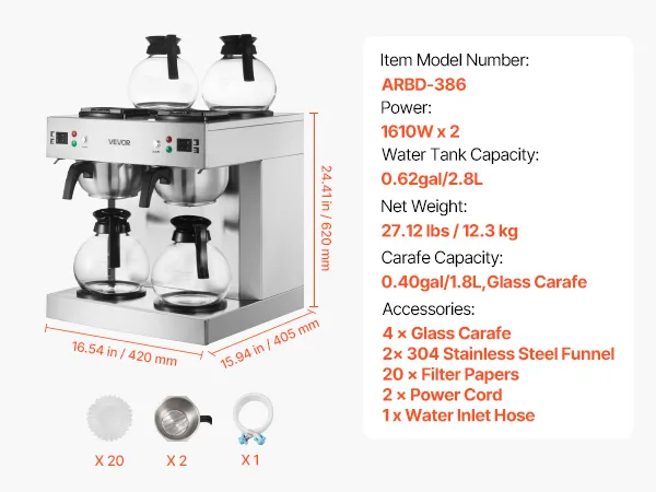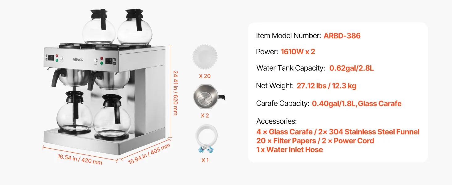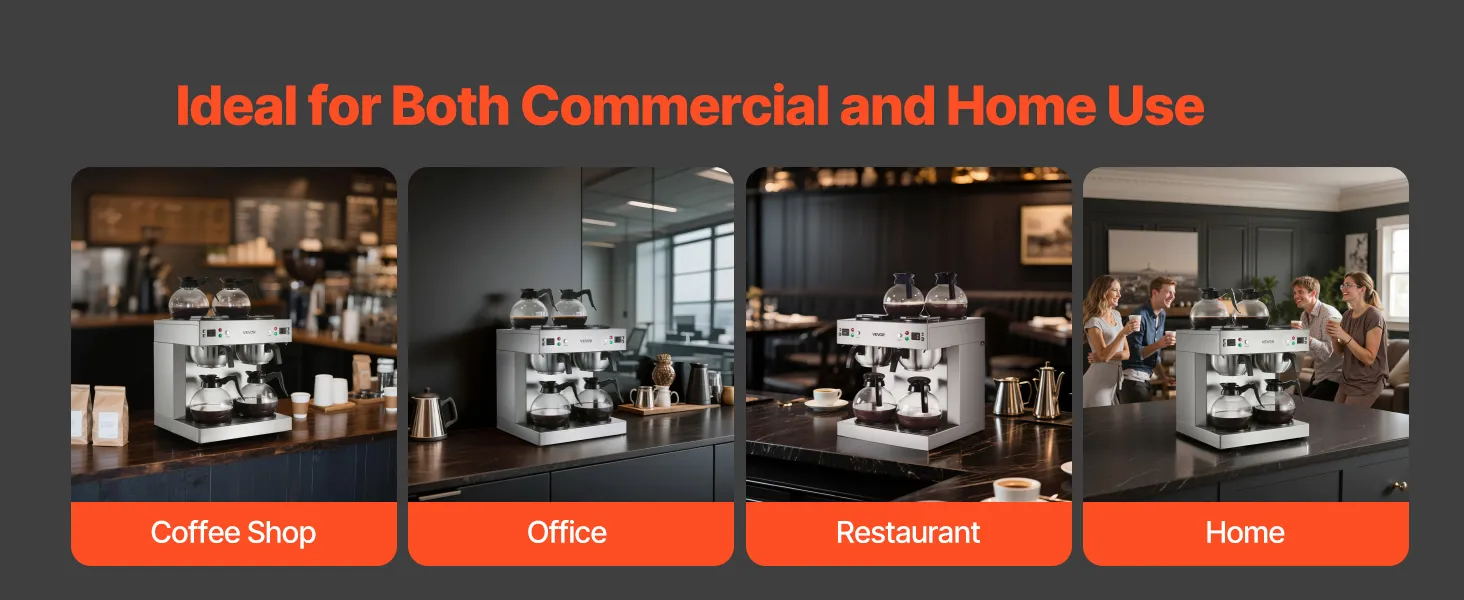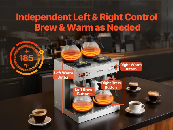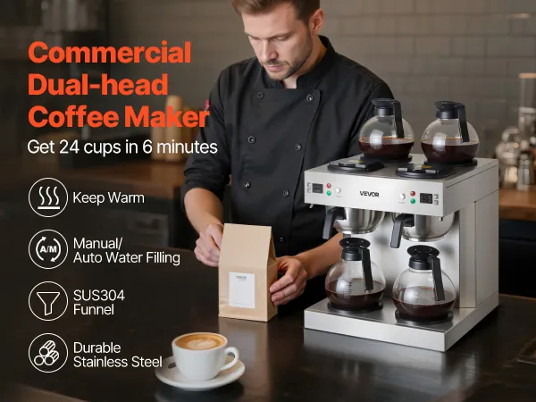 Efficient Coffee Brewing: With two brewing heads, the VEVOR commercial drip coffee maker brews two pots simultaneously, producing 24 cups of delicious coffee in just 6 minutes, doubling the output without the wait