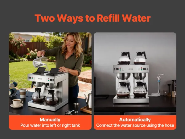 Two Ways to Refill Water: This coffee maker offers both manual and automatic water filling, giving you flexibility and convenience for continuous brewing