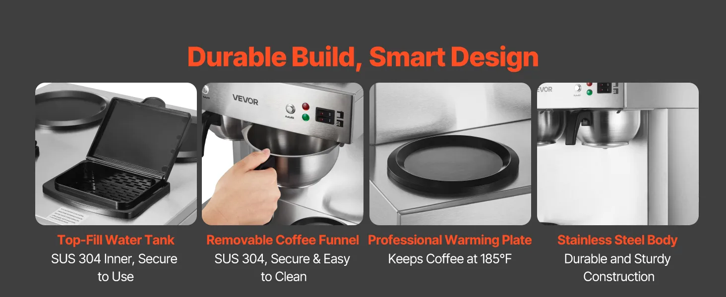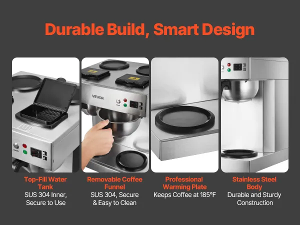 Our drip coffee maker features a top-fill SUS 304 water tank for secure use, a removable SUS 304 coffee funnel for easy cleaning, a professional warming plate to maintain coffee at 185°F, and a sturdy stainless steel body for long-lasting durability.