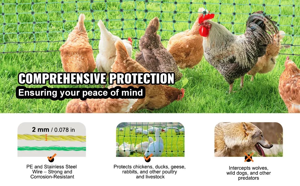 • Effective Electric Current: The electric net fence precisely controls the intensity of the electric current, effectively protecting without harming animals. It ensures the security of your poultry and livestock while maintaining long-term protection of the fence.