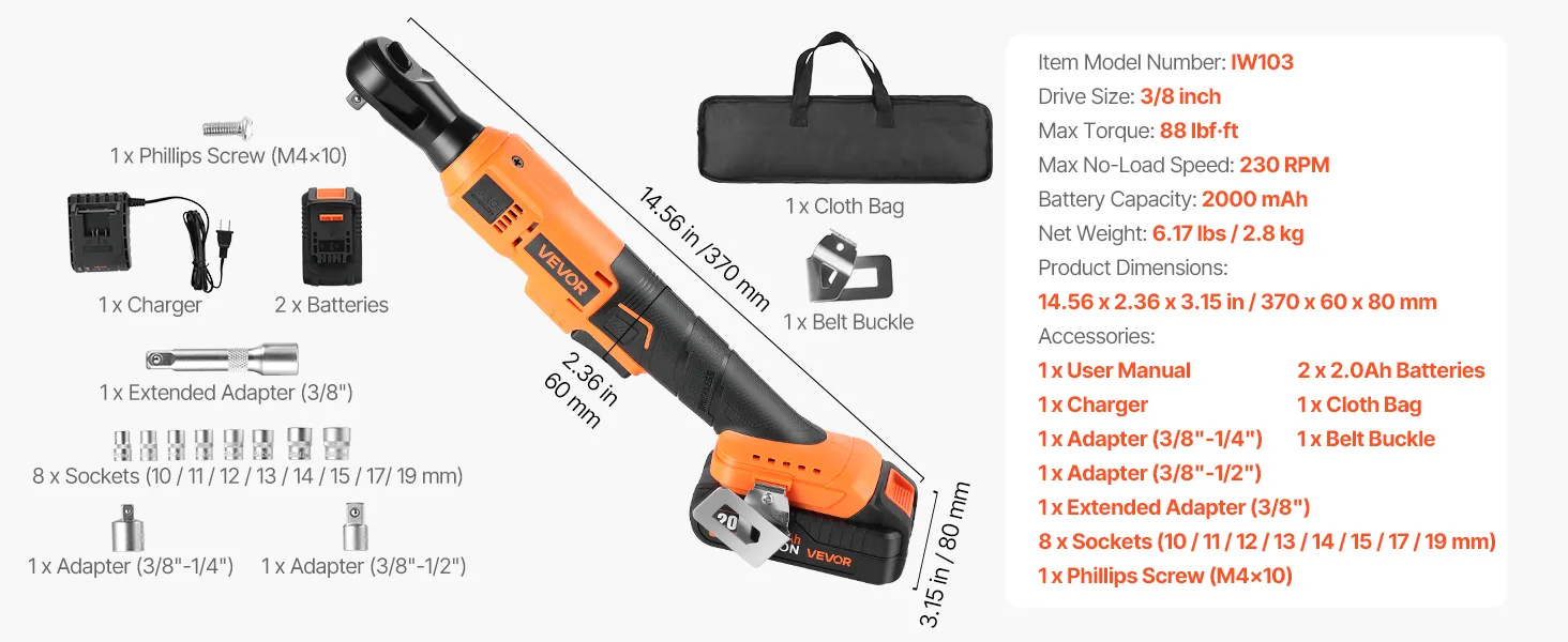 VEVOR Cordless Ratchet Wrench, 3/8 inch Drive, 230 RPM, up to 88 ft-lbs of Torque, Battery Powered Electric Ratchet Wrench Set with Two 2.0Ah Batteries, Charger, Sockets, Adaptors and Cloth Bag