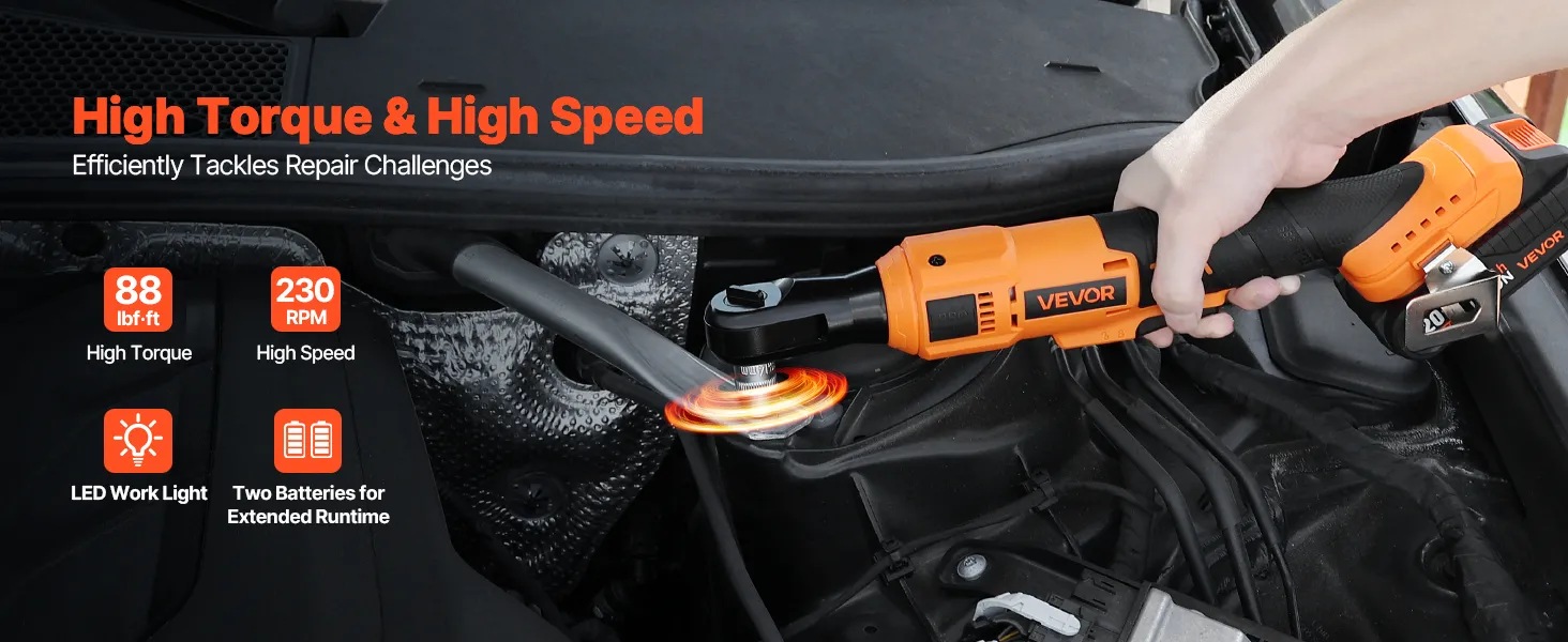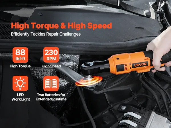 High-Performance Motor: Delivers up to 88 ft·lbs torque and 230 RPM speed, the cordless ratchet wrench handles loosening tough bolts and repetitive fastening tasks easily. Ideal for automotive, electrical, and mechanical work, ensuring efficient operation