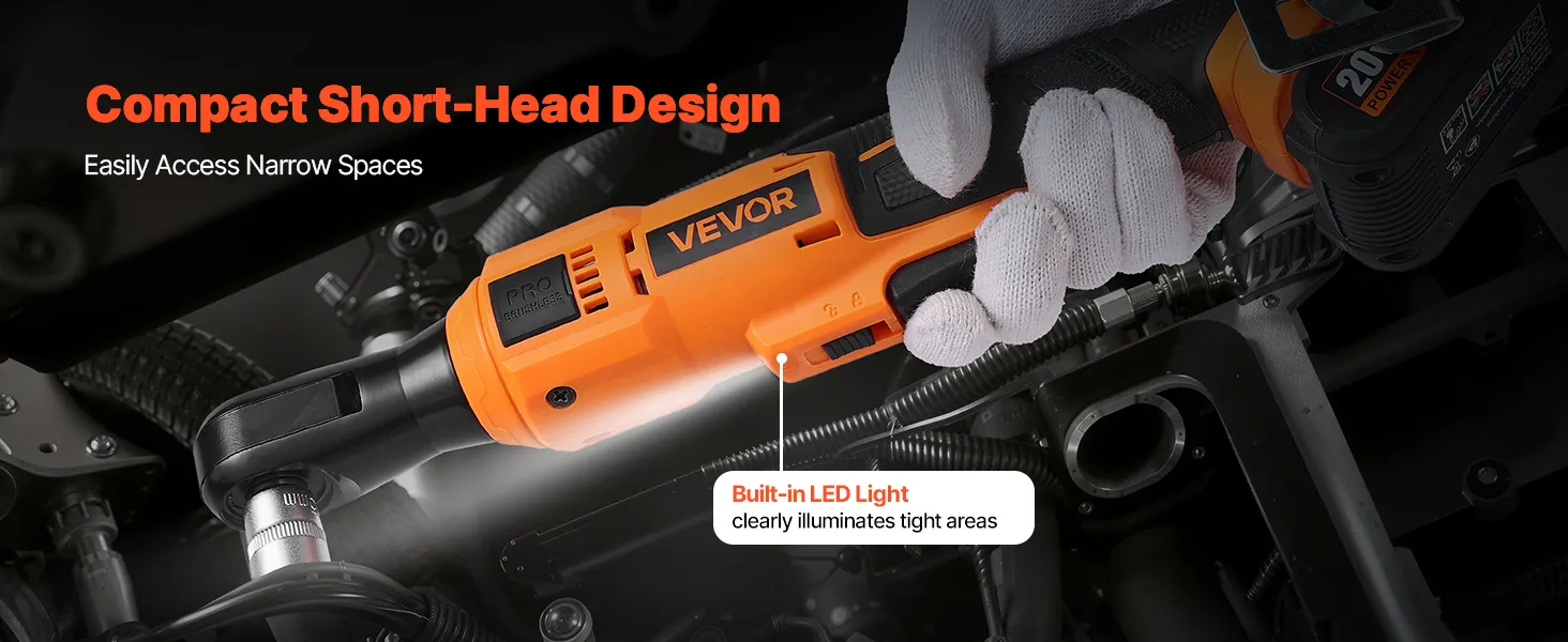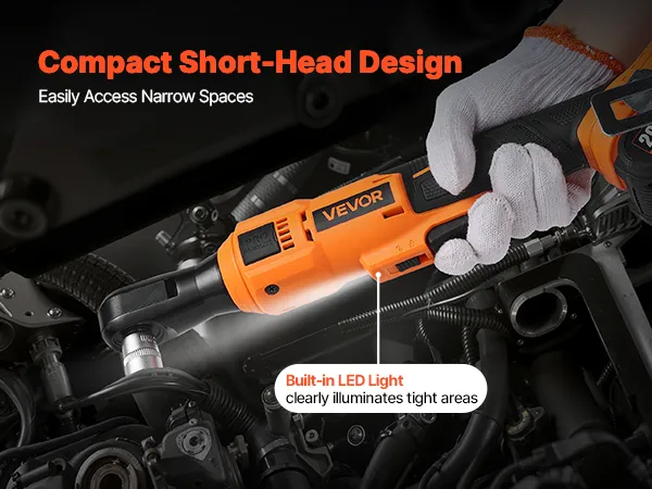 Our cordless ratchet set features a short head with an extended neck and bright LED light, making it easy to reach tight, dark spaces like engine bays, furniture gaps, or behind equipment. It ensures precise screw alignment and efficient operation.