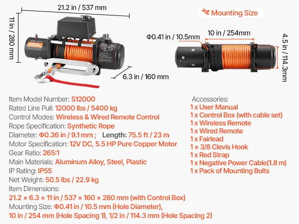 Wide Compatibility: The universal mounting pattern fits most SUVs, pickups, and Jeeps. The recovery winch set includes fairlead, hook, and power cables—ready for fast setup and use.