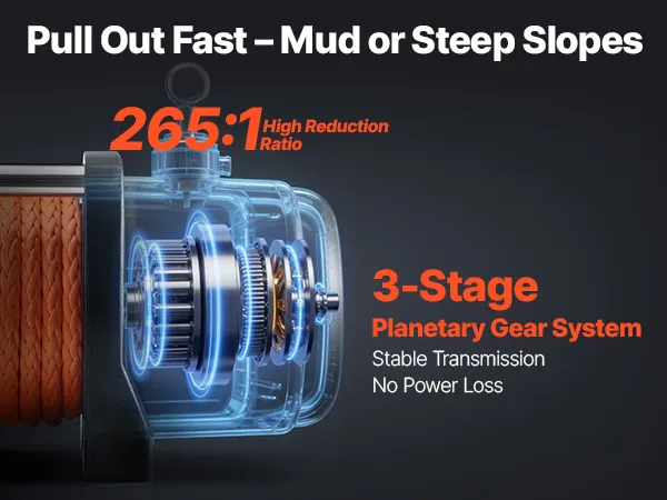 High-Power Rescue: This 5.5HP motor of the jeep winch with a 265:1 3-stage planetary gear delivers steady pulling force. It runs long hours without overheating, giving you dependable strength for off-road recovery