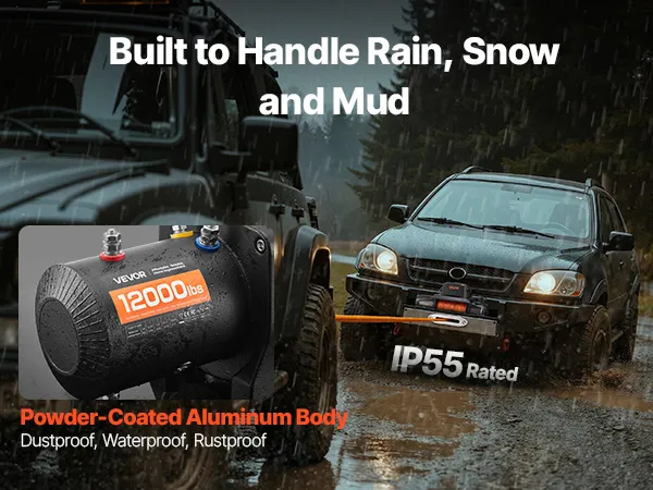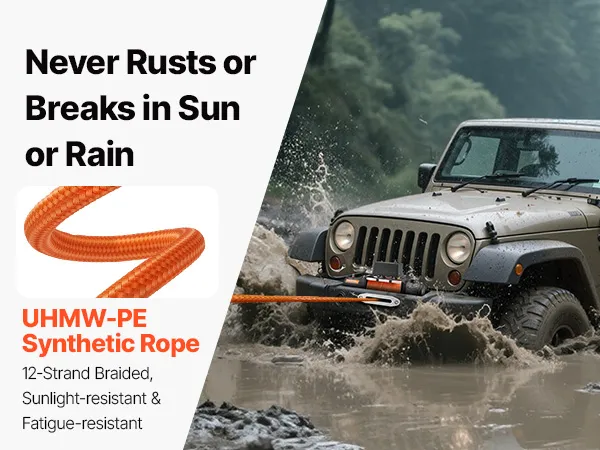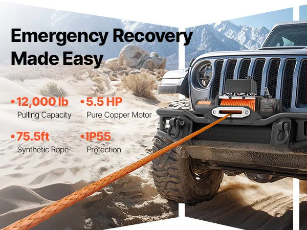 All-Weather Durable: The 0.36 in x 75.5 ft 12-strand synthetic rope resists sunlight, wear, and breakage. With an IP55 sealed coated alloy body, the truck winch stays tough against dust, rain, and harsh terrain