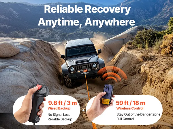 Secure Remote Control: The 59 ft wireless remote of the winch lets you stay at a secure distance while operating. A 9.8 ft wired remote is included as backup, ideal for mountain trails or areas with weak signals