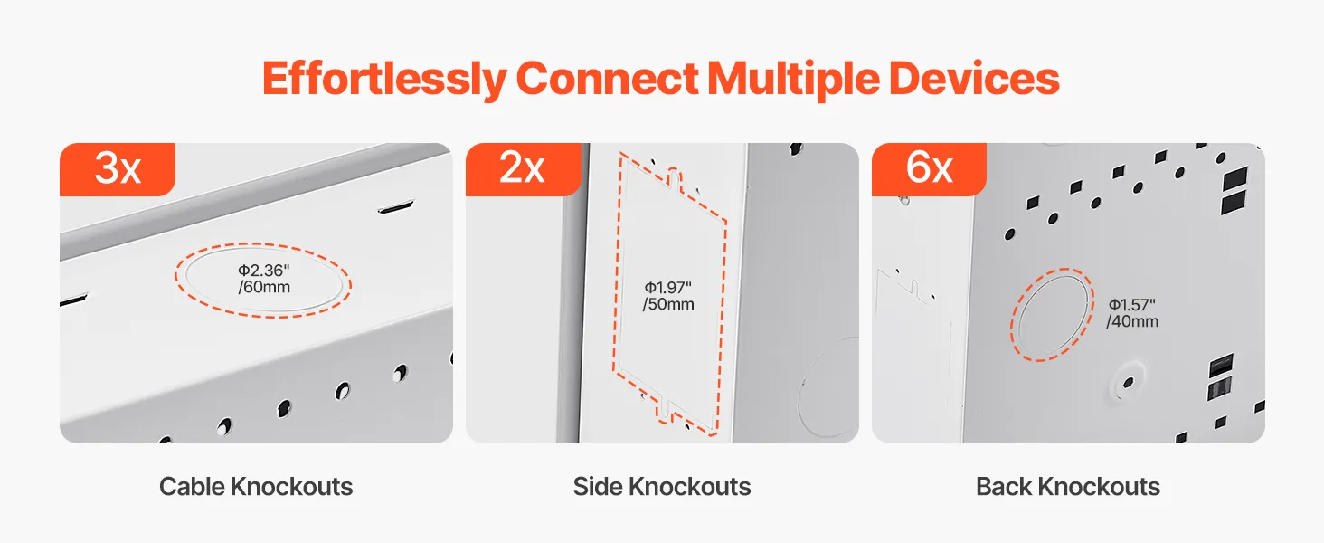 With TVs, gaming consoles, streaming devices, and speakers, it doesn’t take long before cords are everywhere. Thats why the in-wall media Enclosure comes with It comes with multiple knockout holes. That is, three 2.36 in/60 mm top cable knockouts, two 1.97 in/50 mm knockouts, and six 1.57 in/40 mm knockouts, with two additional reserved knockouts for outlet boxes.