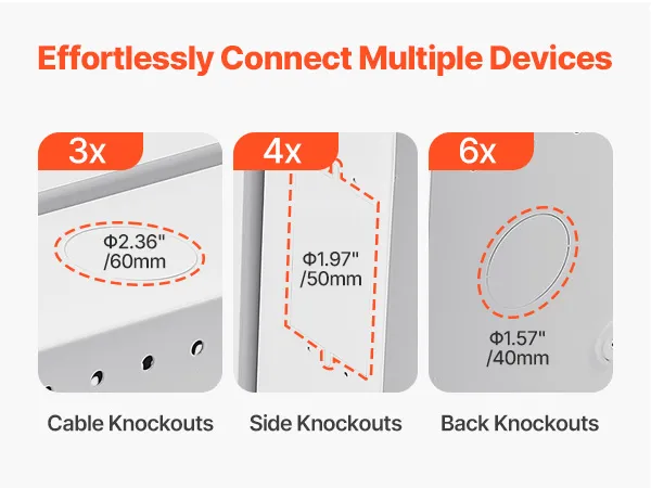 Optimized Cable Management: With three 2.36 in/60 mm top cable knockouts, four 1.97 in/50 mm knockouts, and six 1.57 in/40 mm knockouts, along with two reserved knockouts for outlet boxes, this in-wall media box provides exceptional flexibility for organizing and storing your devices