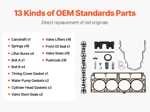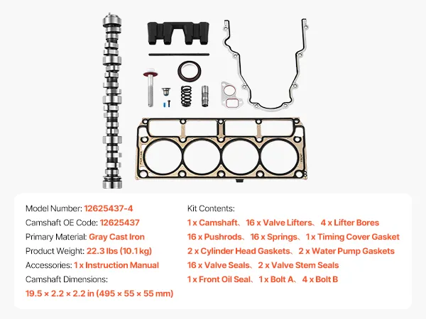 Complete Kit: This camshaft kit (OE: 12625437, SP011-16) comes with 13 essential components, including the camshaft, lifters, lifter bases, pushrods, springs, timing cover gasket, front crankshaft seal, cylinder head gasket, water pump gasket, and more. All core parts are designed to match OEM specifications.