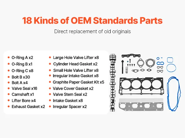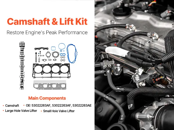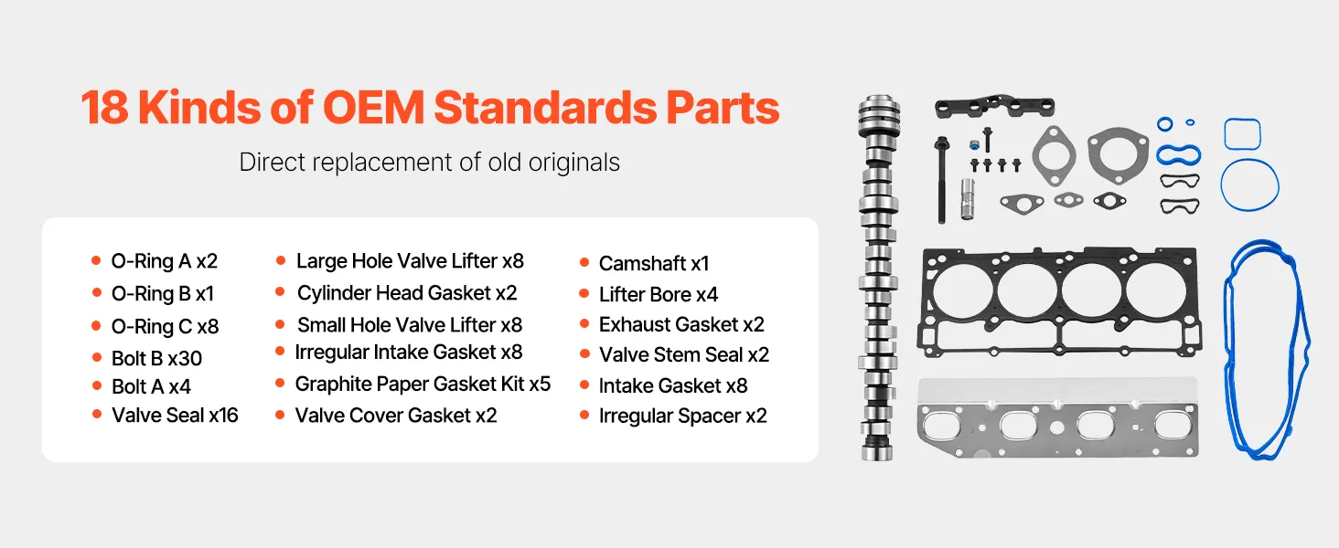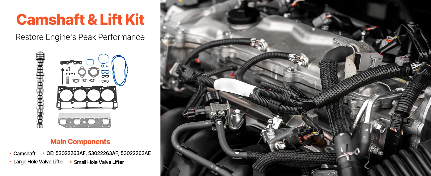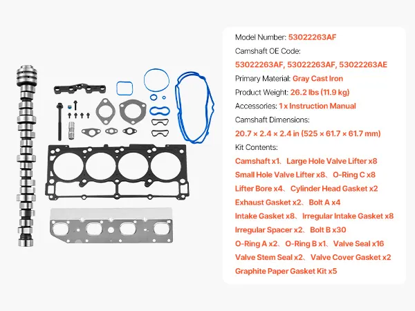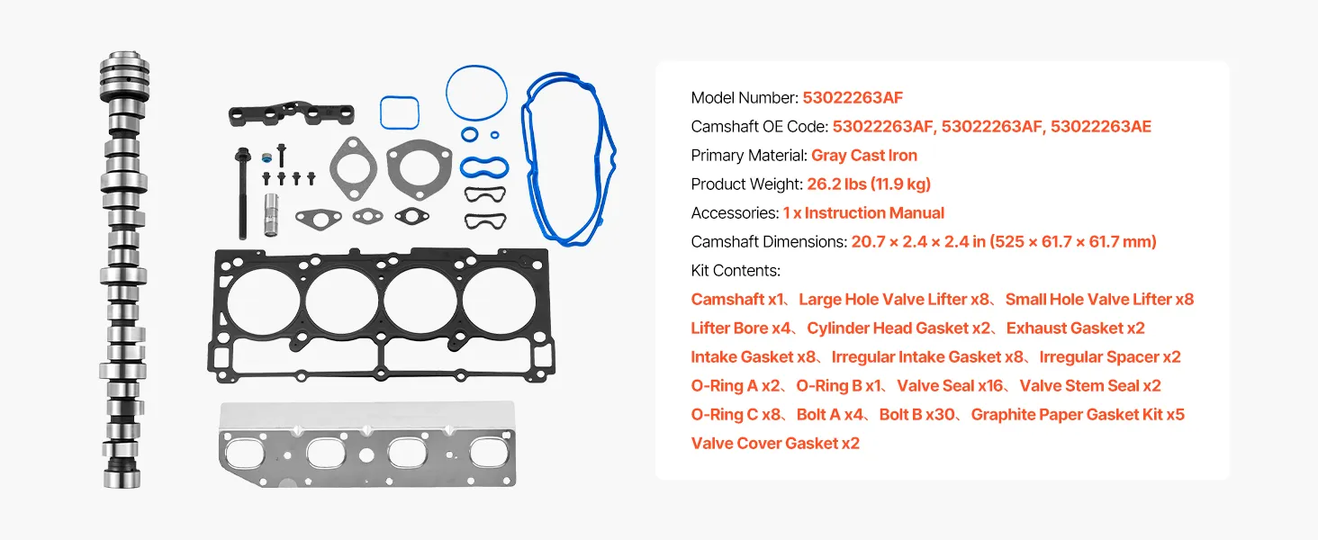 The 18 components in this lifter camshaft kit are required to repair damaged or worn-out valvetrain components. Important parts include the cylinder head gaskets, intake gaskets, camshaft, hydraulic lifters, lifter guides, valve seals, valve plugs, and other seals listed in OE: 53022263AF and 53022263AE. To guarantee a proper fit and smooth operation, every component meets OEM specifications.