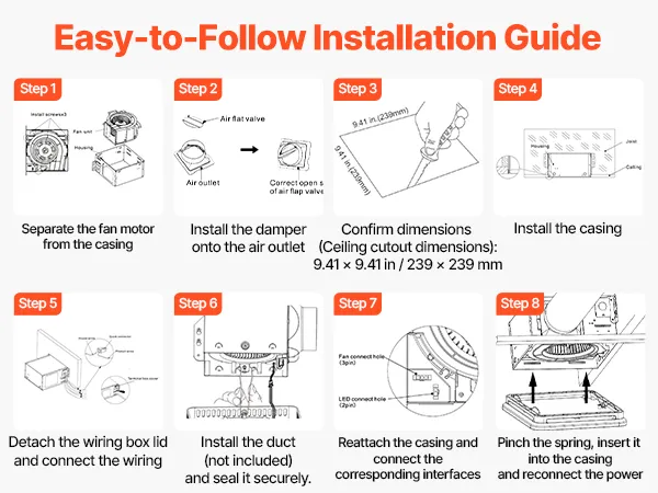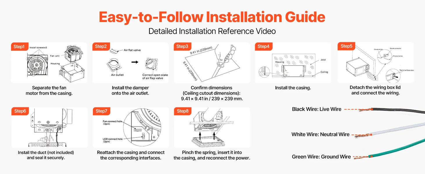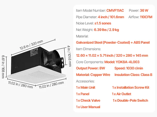 User-friendly Installation: Measuring 12.60 x 11.02 x 6.61 in / 320 x 280 x 168 mm, fits ceilings sized 9.41 x 9.41 in / 239 x 239 mm, with a standard 4-inch duct interface, this ceiling fan includes quick connector and screws for DIY-friendly setup
