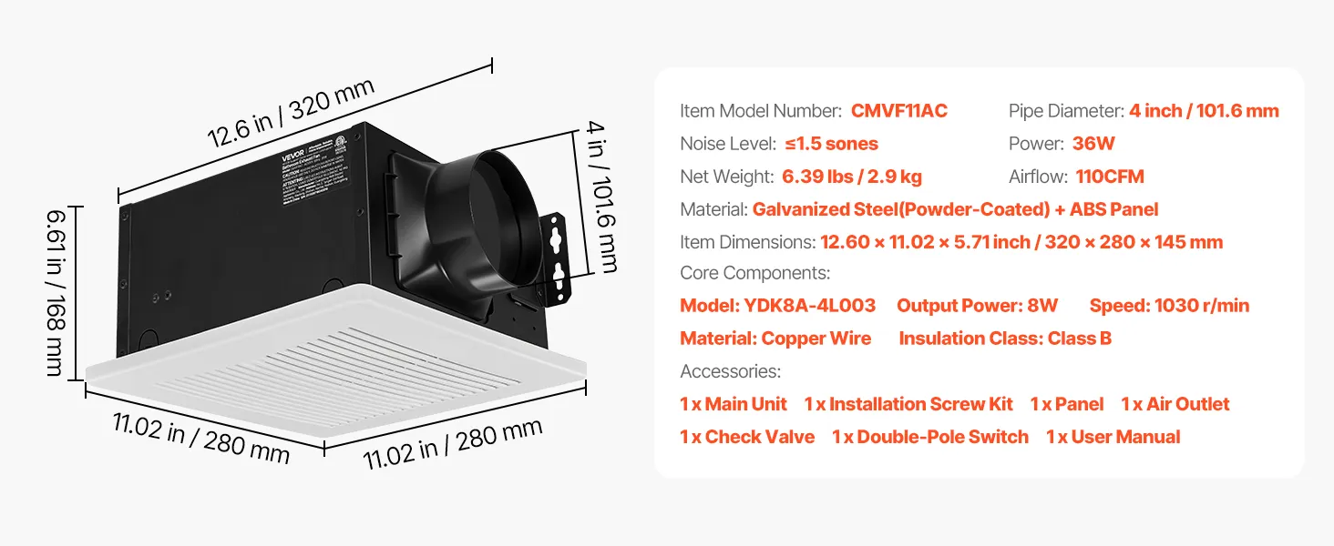 Powerful Ventilation: Equipped with a premium AC motor, this bathroom exhaust fan delivers a steady airflow of 110CFM, quickly covering 129–161 ft² (12–15 m²). It restoring fresh air even after long showers, ensure more comfortable bathroom experience