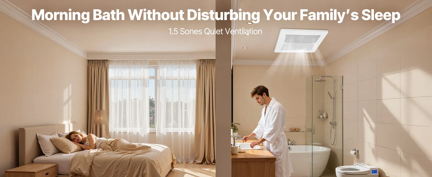 Quiet Operation: Operating at only 1.5 sones (≤60dB), this bathroom fan is as quiet as a soft conversation, ideal for bathrooms near bedrooms, providing strong ventilation while maintaining a peaceful bathing condition