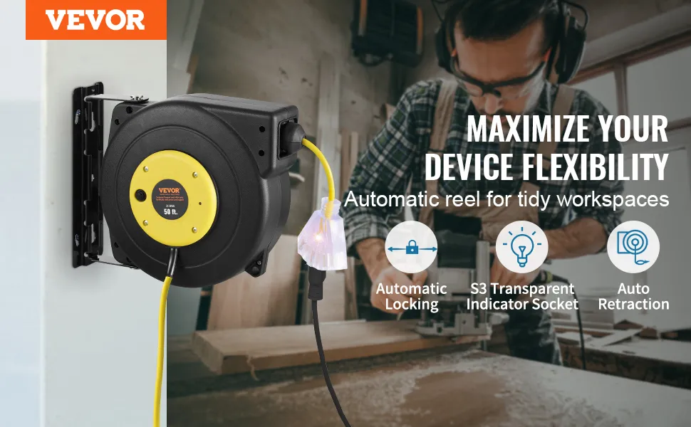 The 50-foot 14AWG/3C SJTOW cable on the VEVOR 14 3 retractable cord reel makes it stand out because it is durable, flexible, and prepared for any task. It guarantees steady current flow without voltage drops. This cable has exceptional resistance to water, oil, grease, acids, and even ozone thanks to its SJTOW-grade insulation. It is robust enough to withstand repeated use and flexible enough to roll out smoothly even in colder climates.