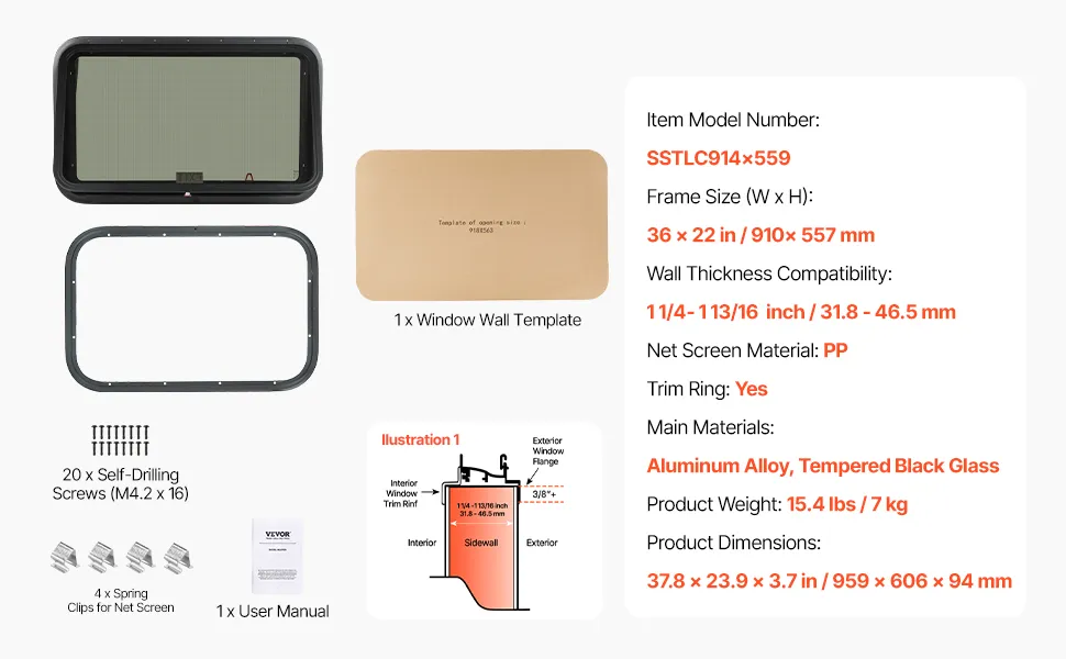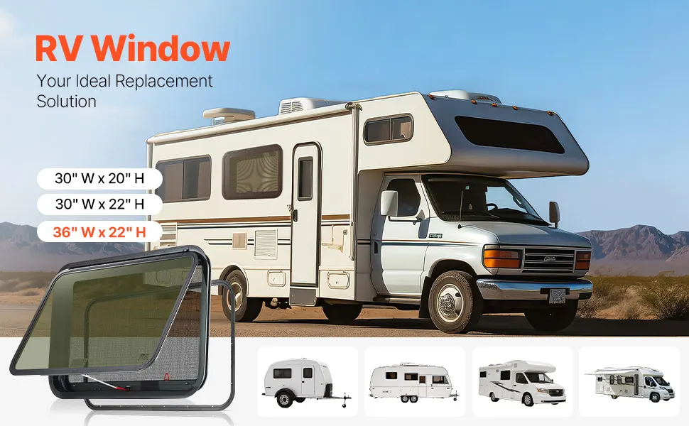 Our 36"W x 22"H RV exit window features high-quality tempered glass, convenient net screen, and security lock, offering a reliable window replacement for teardrop trailer, camper, and cargo trailer. Fit for 1 1/4" - 1 13/16" thickness walls, it delivers comfort and security on your journey.