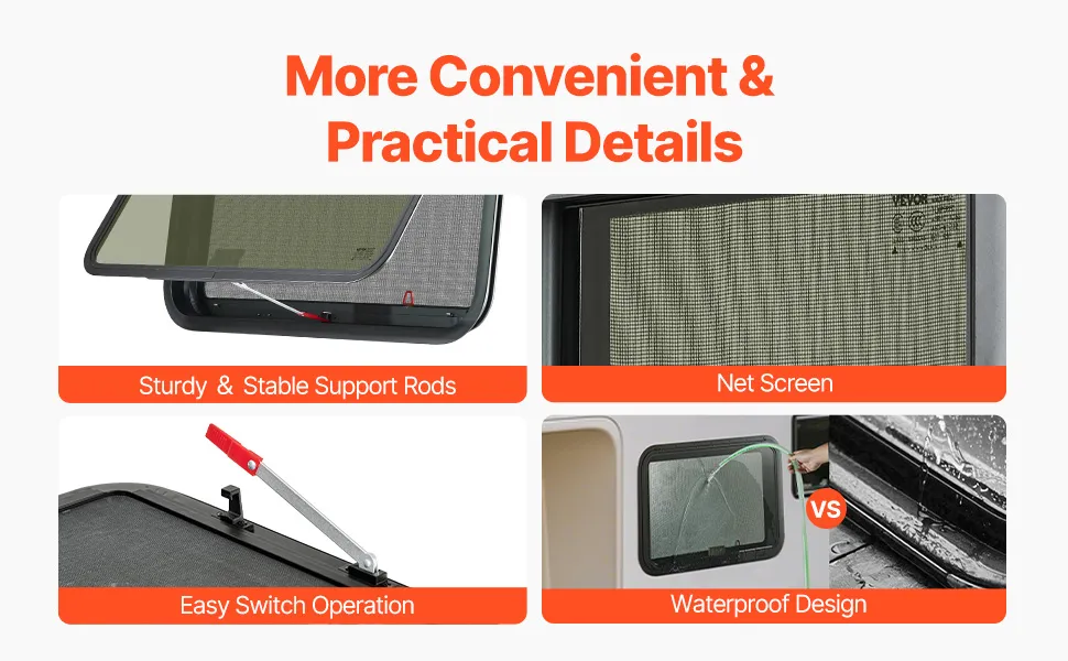 This RV window for trailers offers enhanced security with a safety lock, a convenient net screen for a steady flow of fresh air, and a drainage hole to prevent water buildup. Its tight seal effectively prevents leaks, keeping your RV dry and comfortable.