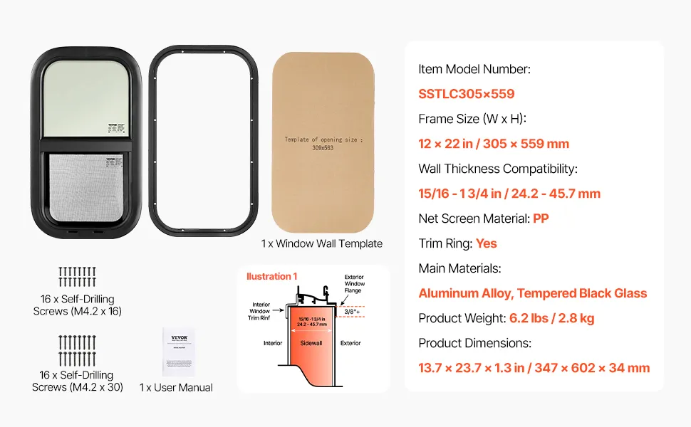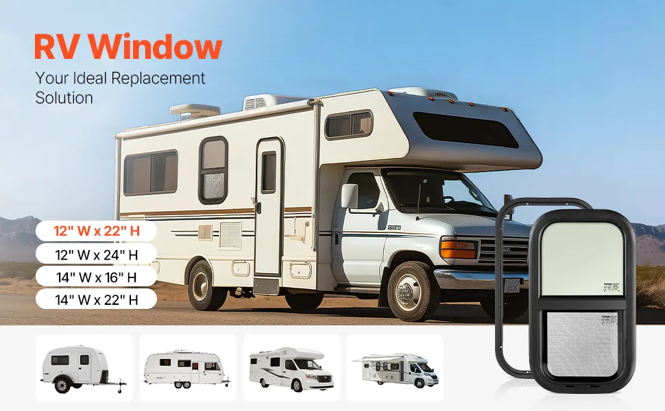 Our 12"W x 22"H vertical sliding window features high-quality tempered glass, convenient net screen, and security lock, offering a reliable window replacement for teardrop trailer, camper, and cargo trailer. Fit for 15/16"-1 3/4" thickness walls, it delivers comfort and security on your journey.