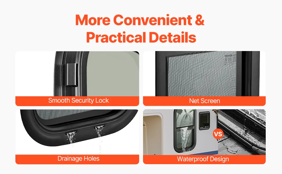 Practical Features: Designed with a security lock for extra protection and a net screen for convenient airflow, this vertical sliding trailer window ensures both security and ventilation. The drainage holes prevent water accumulation, enhancing the seal and preventing leaks, making it a dependable choice for your trailer.